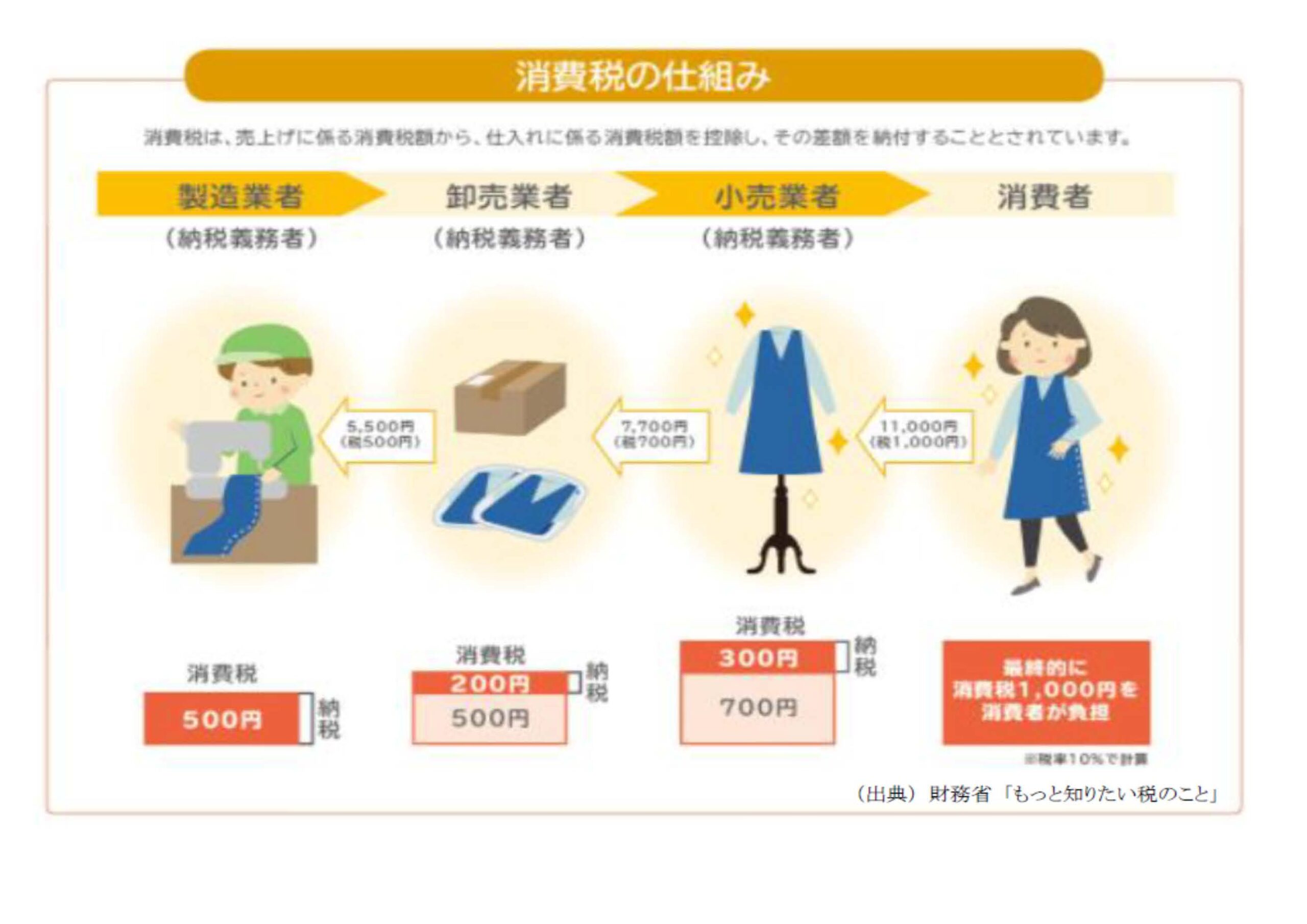 ③小売業者さんは、仕入れたカーディガンを消費者に11,000円(本体価格10,000円、消費税1,000円)で売りました。小売業者さんは消費税1,000円を預かった一方で、卸売業者さんに消費税700円を支払っているため、差額300円を国に納税します。